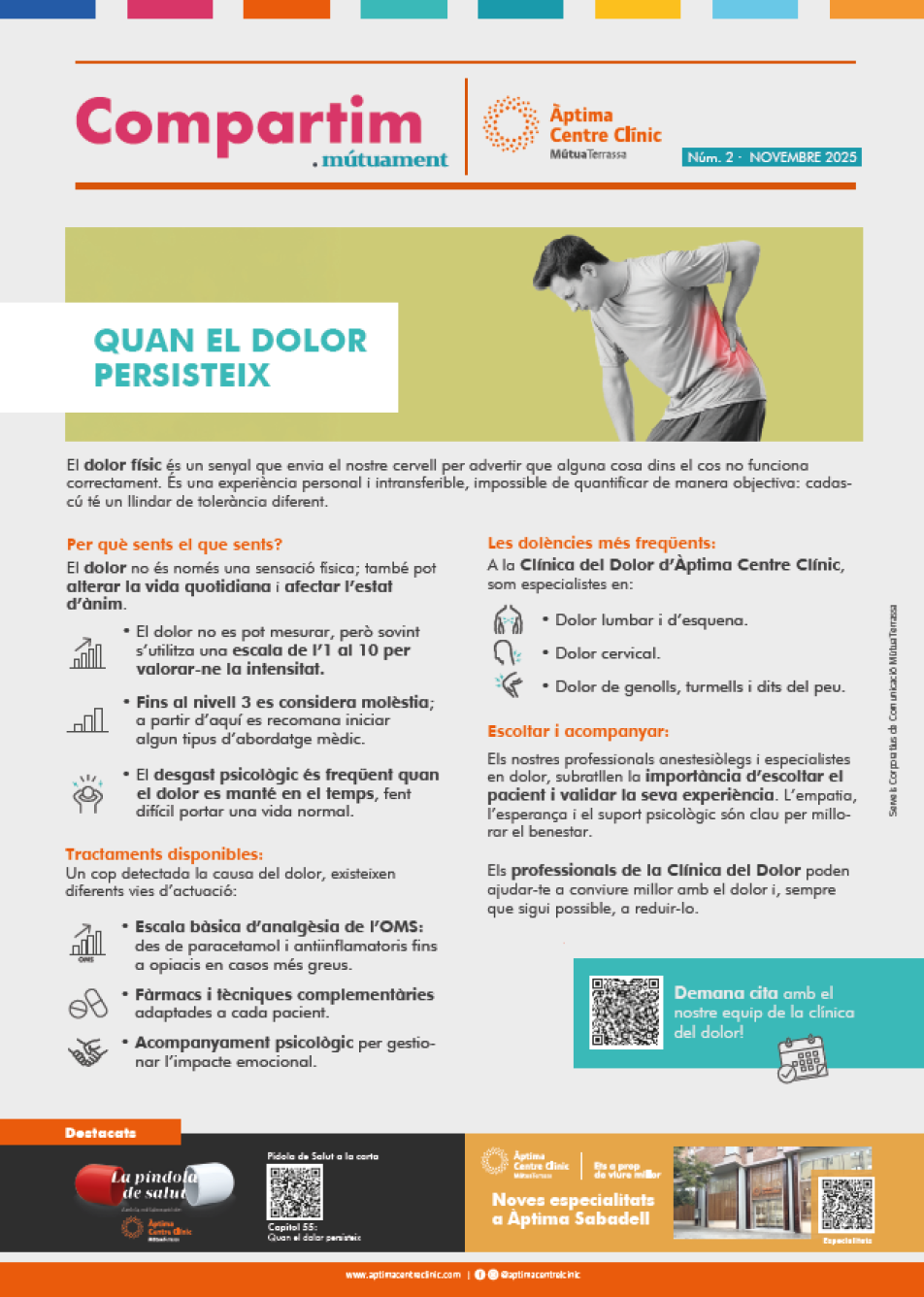 Este otoño, Compartim, el canal de comunicación de Àptima Centre Clínic, estrena su segunda edición. En esta ocasión, nos adentramos en un tema que afecta a muchos pacientes: el dolor físico. A través de este folleto informativo, producido con papel proveniente de fuentes sostenibles, se quiere ofrecer información relevante y útil sobre cómo el dolor se manifiesta, cómo se identifica y cómo se trata.